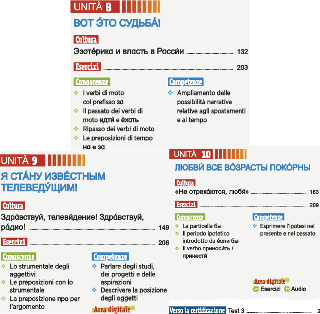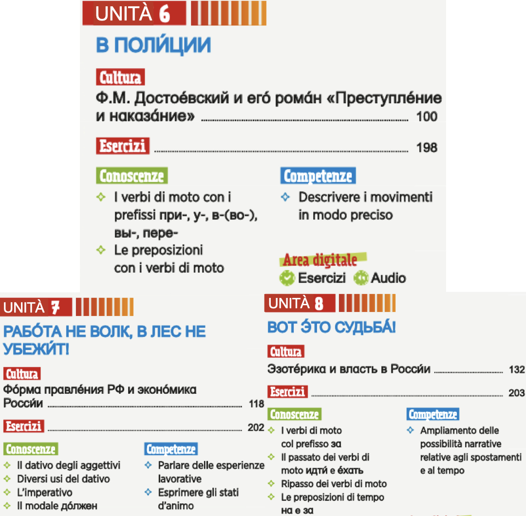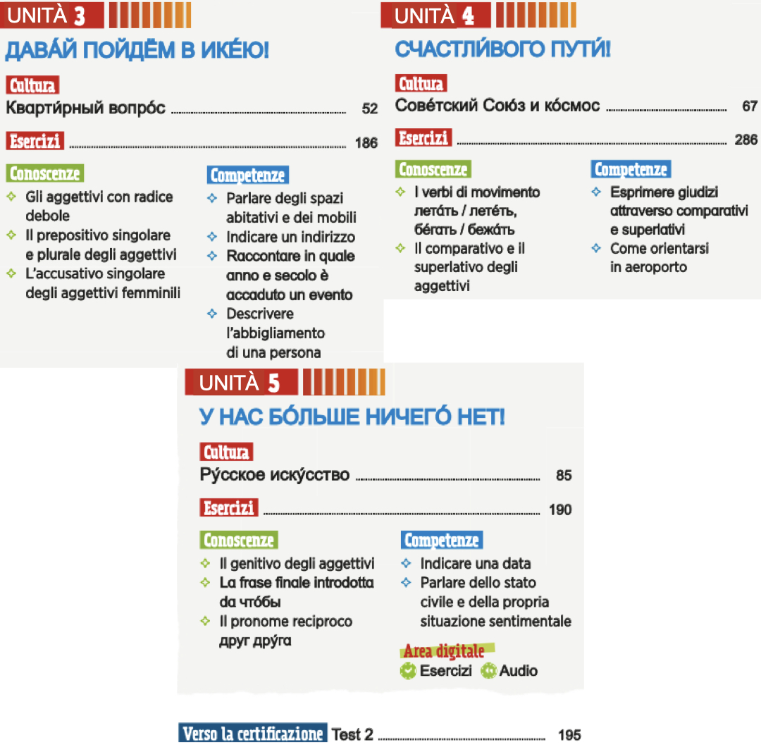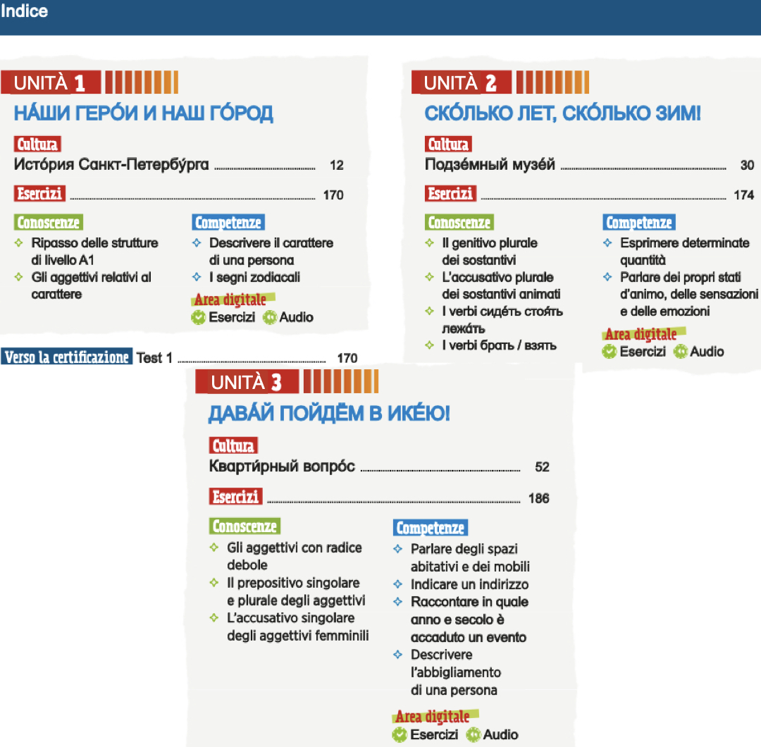 Ciascuna unità del libro inizia con una pagina che presenta le conoscenze lessicali, grammaticali e le competenze comunicative che verranno sviluppate attraverso lo svolgimento di numerosi esercizi e attività didattiche e si articola in diverse sezioni: