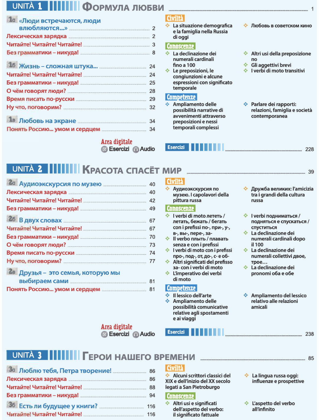 Ogni unità presenta le conoscenze lessicali, grammaticali e le competenze comunicative che verranno sviluppate attraverso lo svolgimento di numerosi esercizi e attività didattiche e si articola in diverse sezioni: