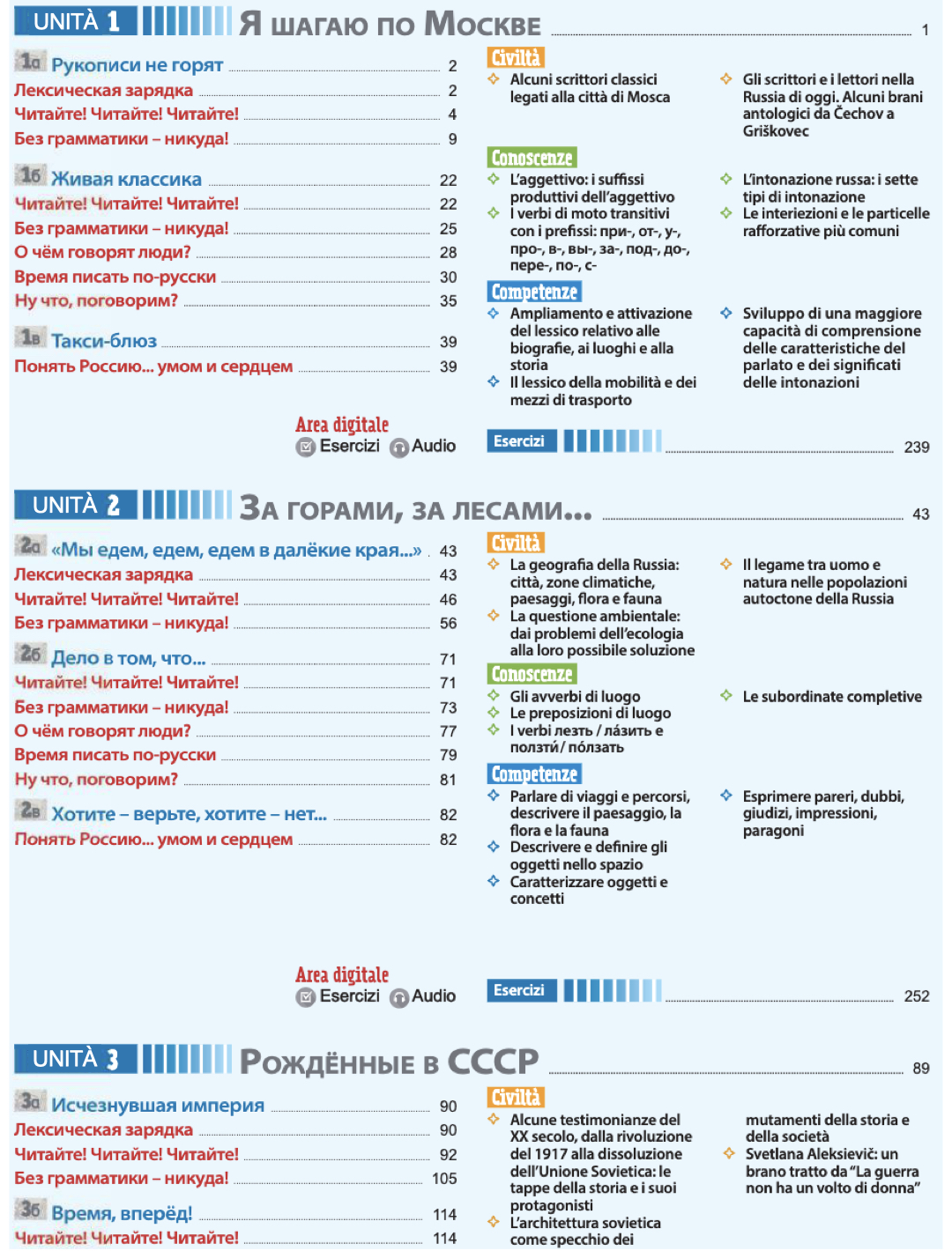 Ciascuna unità del libro presenta le conoscenze lessicali, grammaticali e le competenze comunicative che verranno sviluppate attraverso lo svolgimento di numerosi esercizi e attività didattiche e si articola in diverse sezioni:
